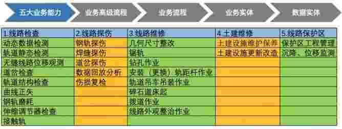 在轨道运维业务中,,,,,,,,,,,我们形成了完整的从业务能力(业务域)-业务流程-业务实体-数据模型的分析梳理过程。。。。。轨道运维业务能力如下图所示::::
